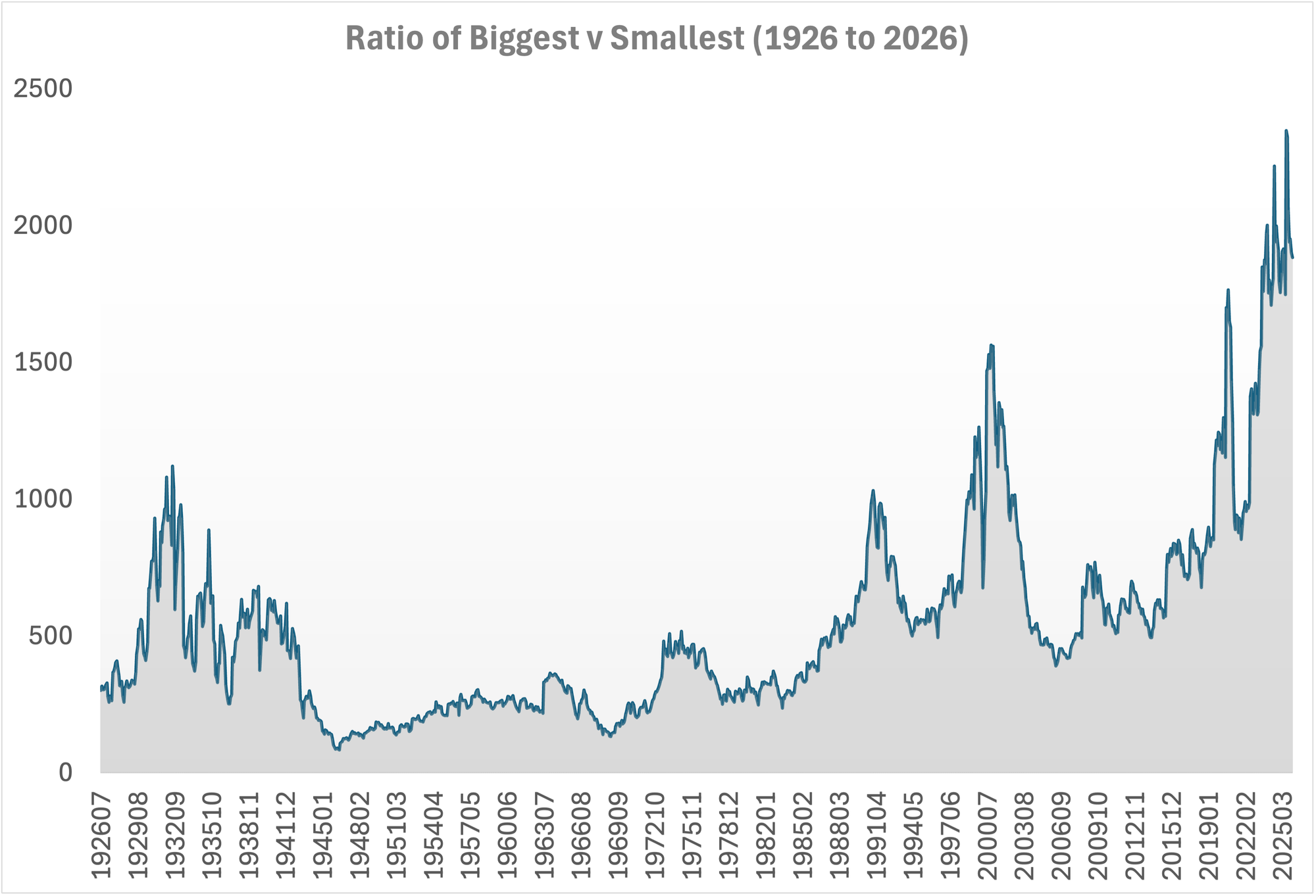 - In 2026 we're at levels that have historically preceded small winning. The blue line turned up mid-2025, meaning smalls are already winning while the biggest have stalled.