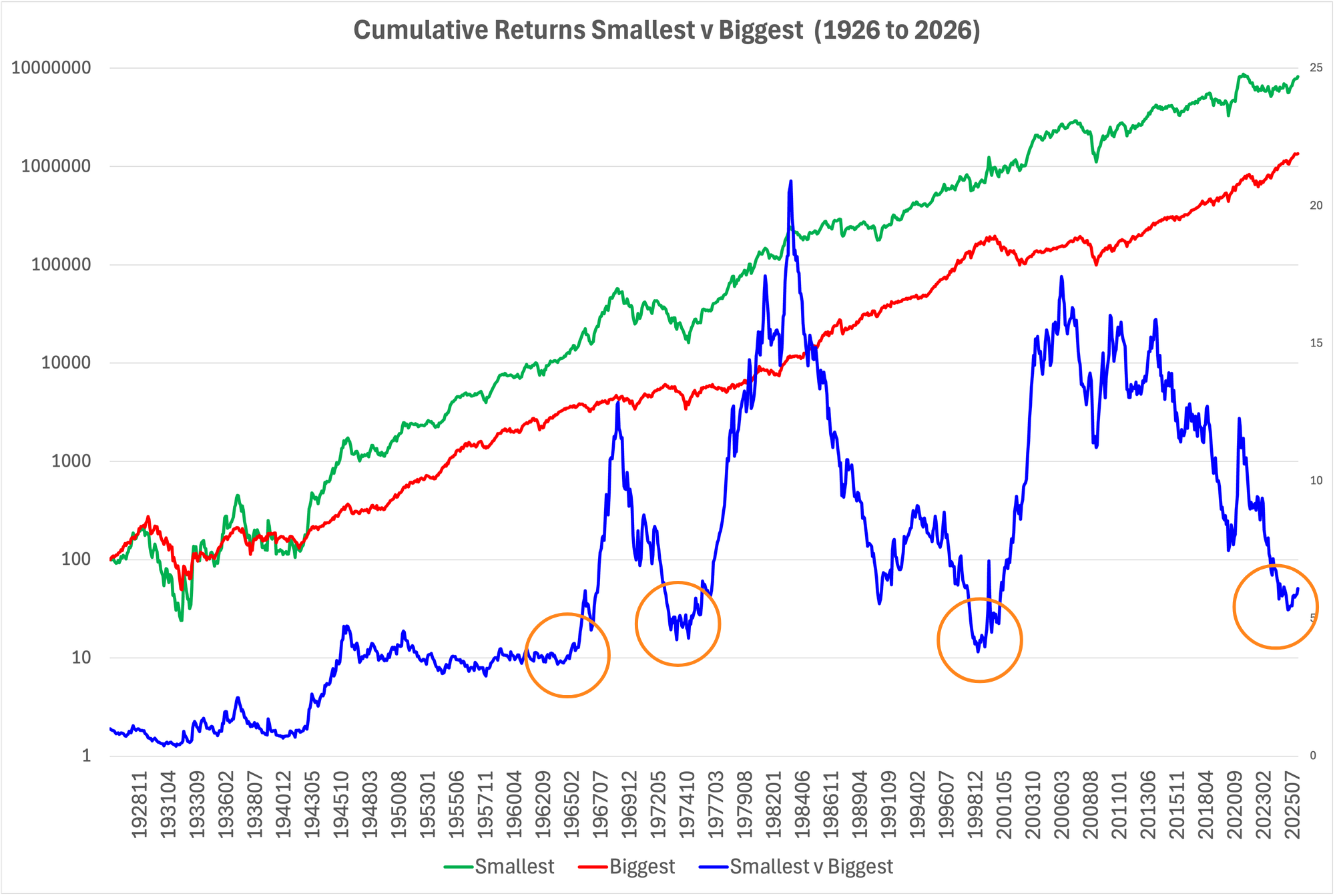 Over the last century the smallest stocks (green, LHS) have beaten the biggest stocks (red, LHS) by six times (blue, RHS). But not in a straight line. The market has cycled. And the cycles were long.